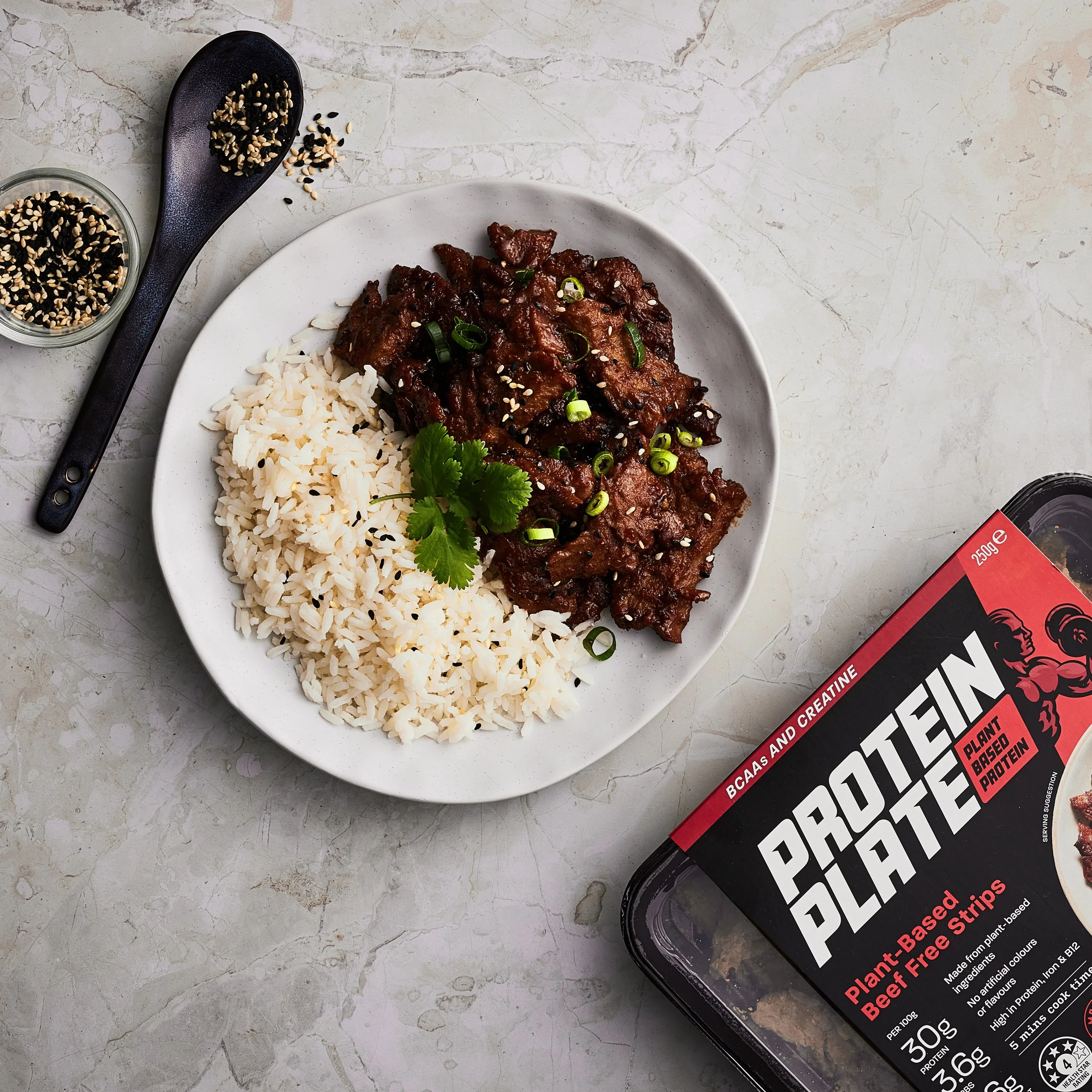 250g Protein Plate Plant Based Beef Strips (available in the chilled plant-based section at Woolworths)